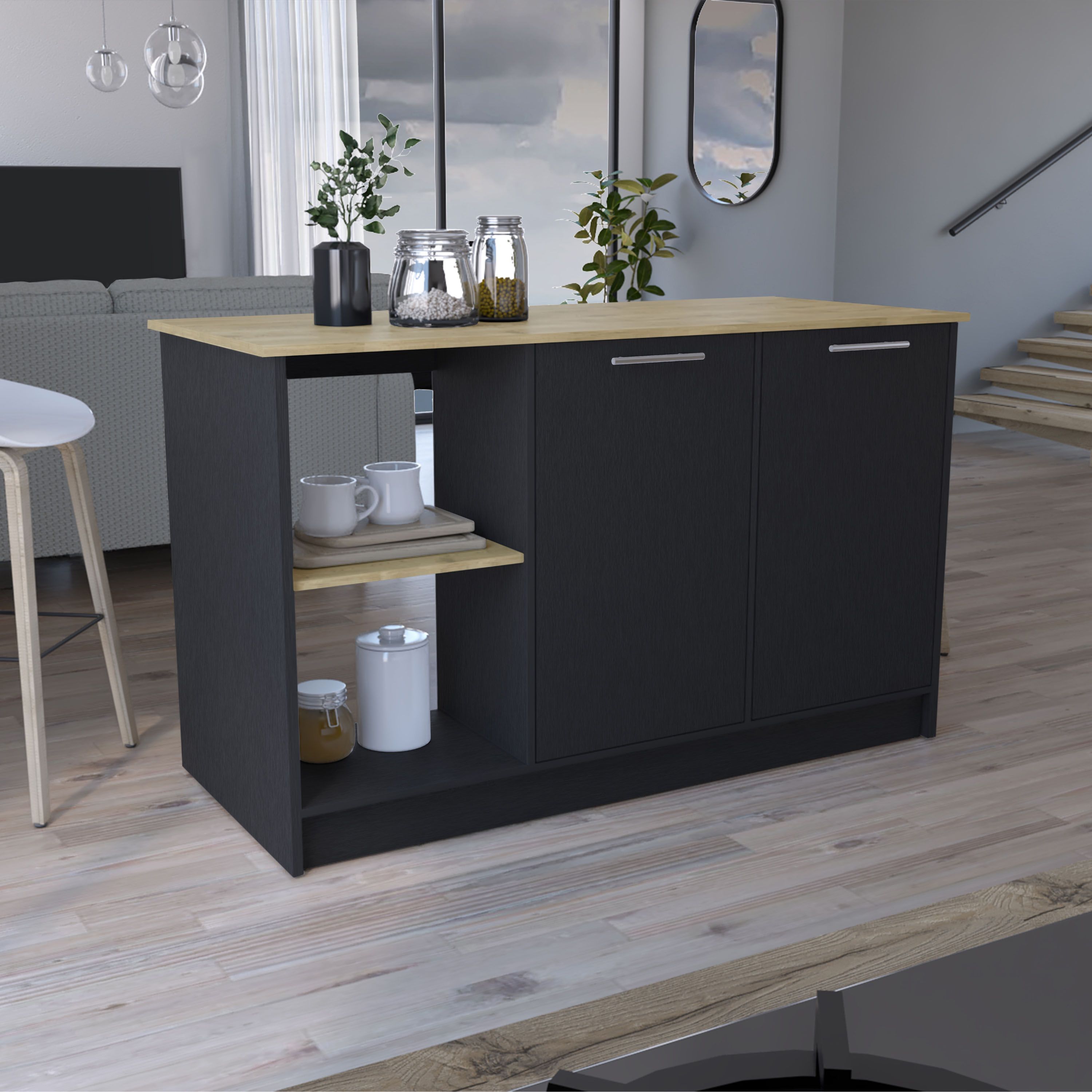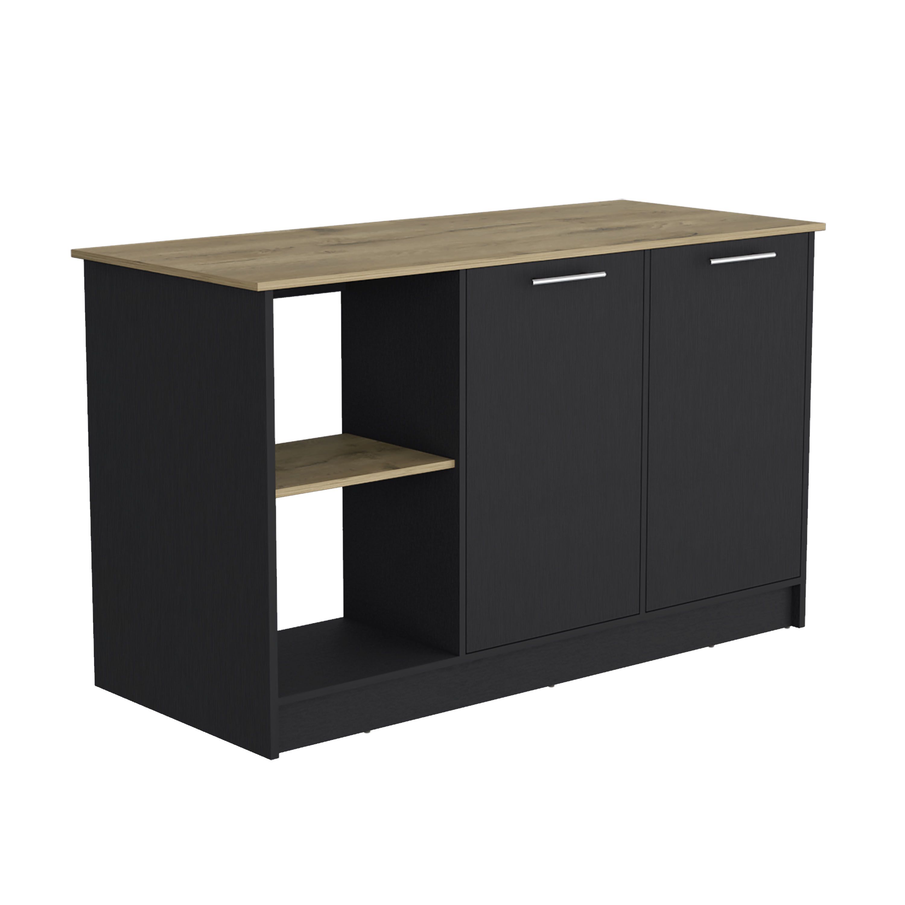 Juniper Kitchen Island with Large Top Surface, Double Door Cabinet, and Open Shelves Black / Macadamia