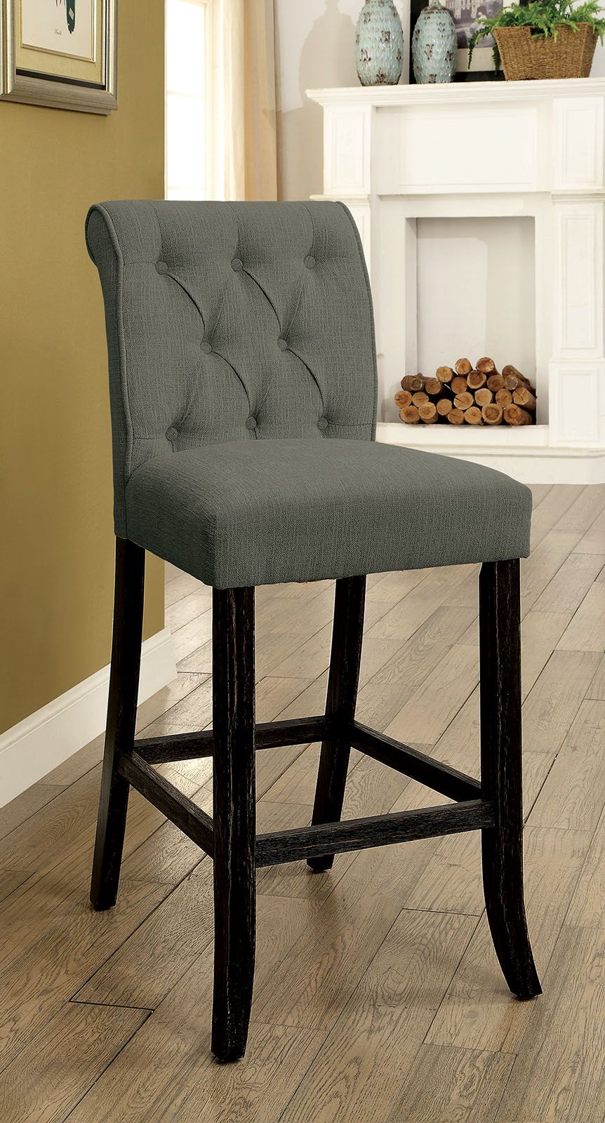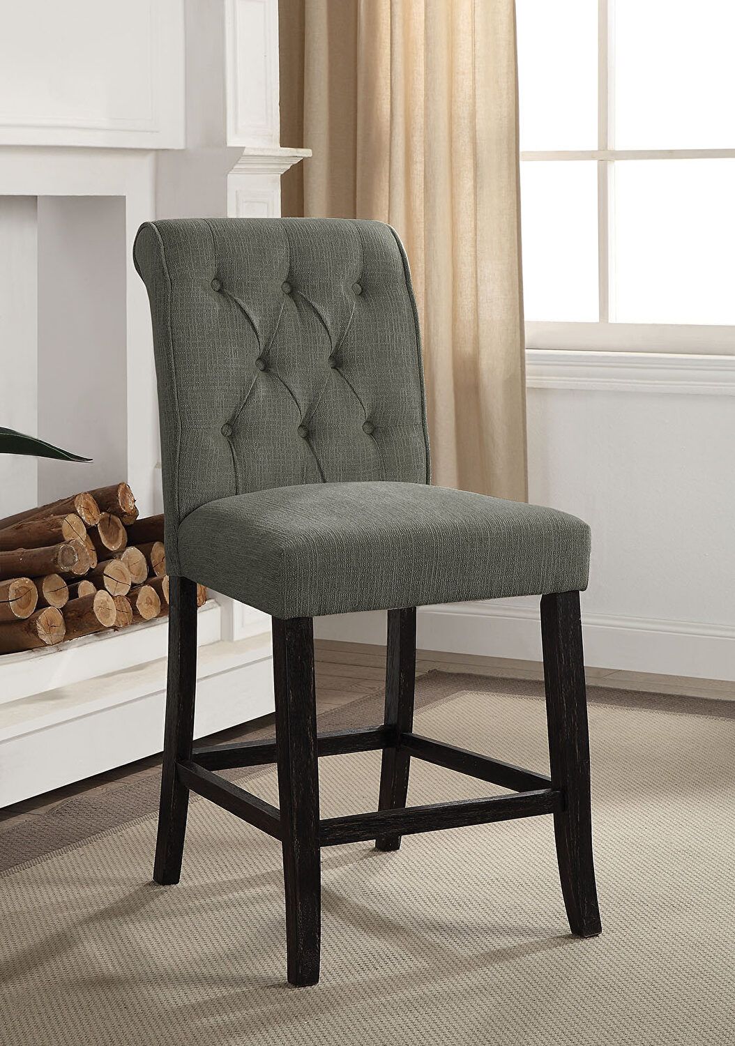 Dining Room Furniture Rustic Style Set of 2 Counter Height Chairs Grey Chenille Fabric Upholstered Tufted Kitchen Breakfast