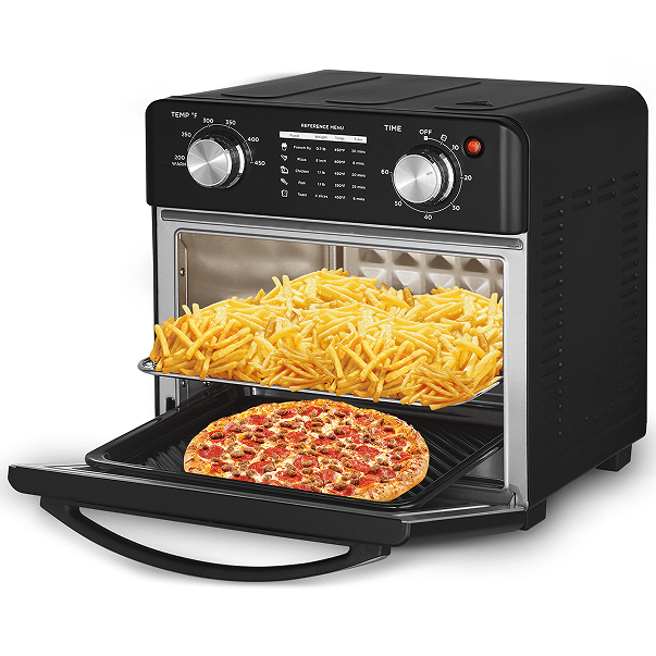 Fast and even cooking time (up to 60 minutes, dehydration up to 12 hours). It is faster than a traditional oven, but has crispier, tastier results for a variety of foods. The countertop oven with 1400W high-power heating produces 90% less fat than traditional frying methods, and contains almost no oil. The countertop oven temperature can be adjusted between 101F and 428°F, allowing you to fry a variety of foods. The air fryer oven automatically cools the inside for a few minutes after each use.