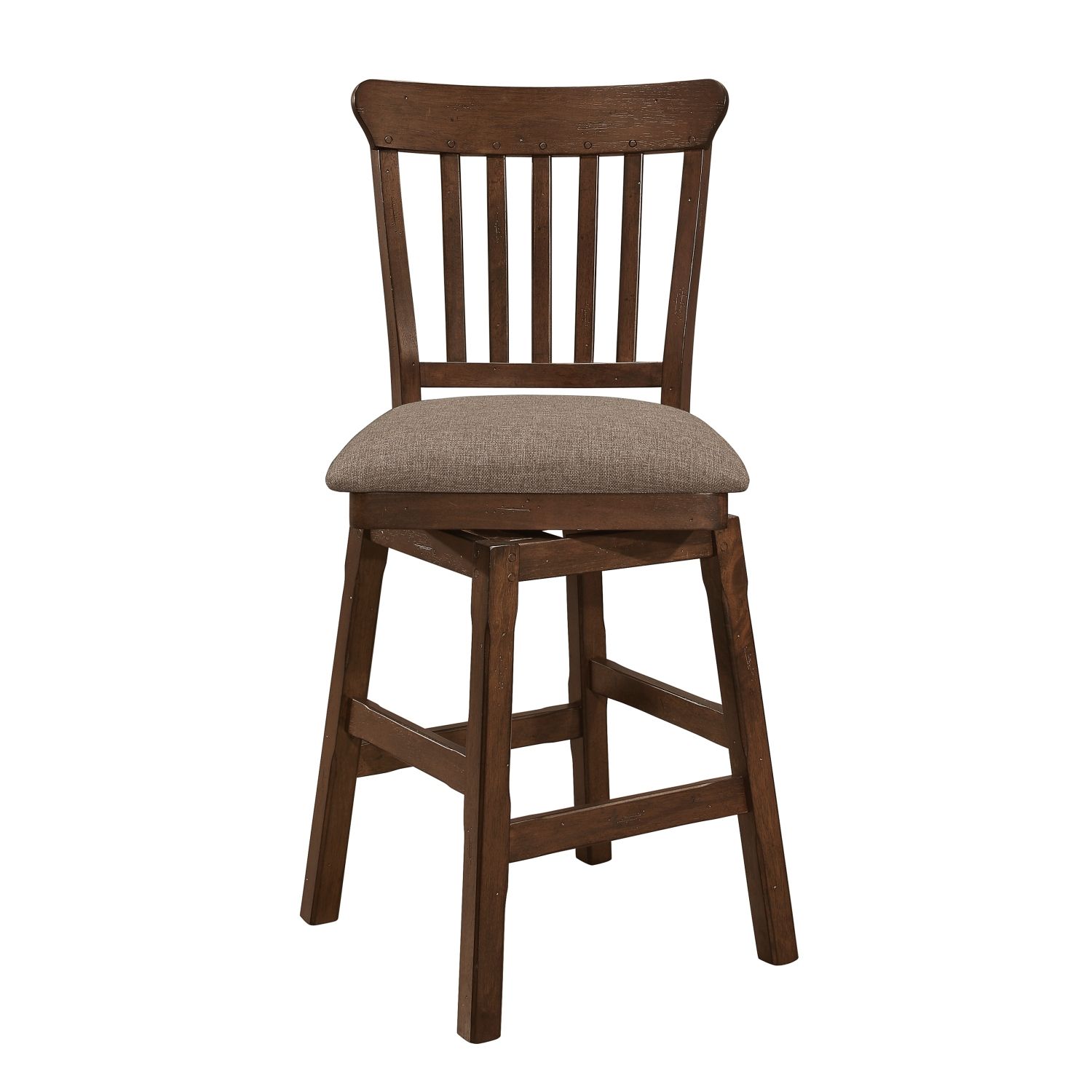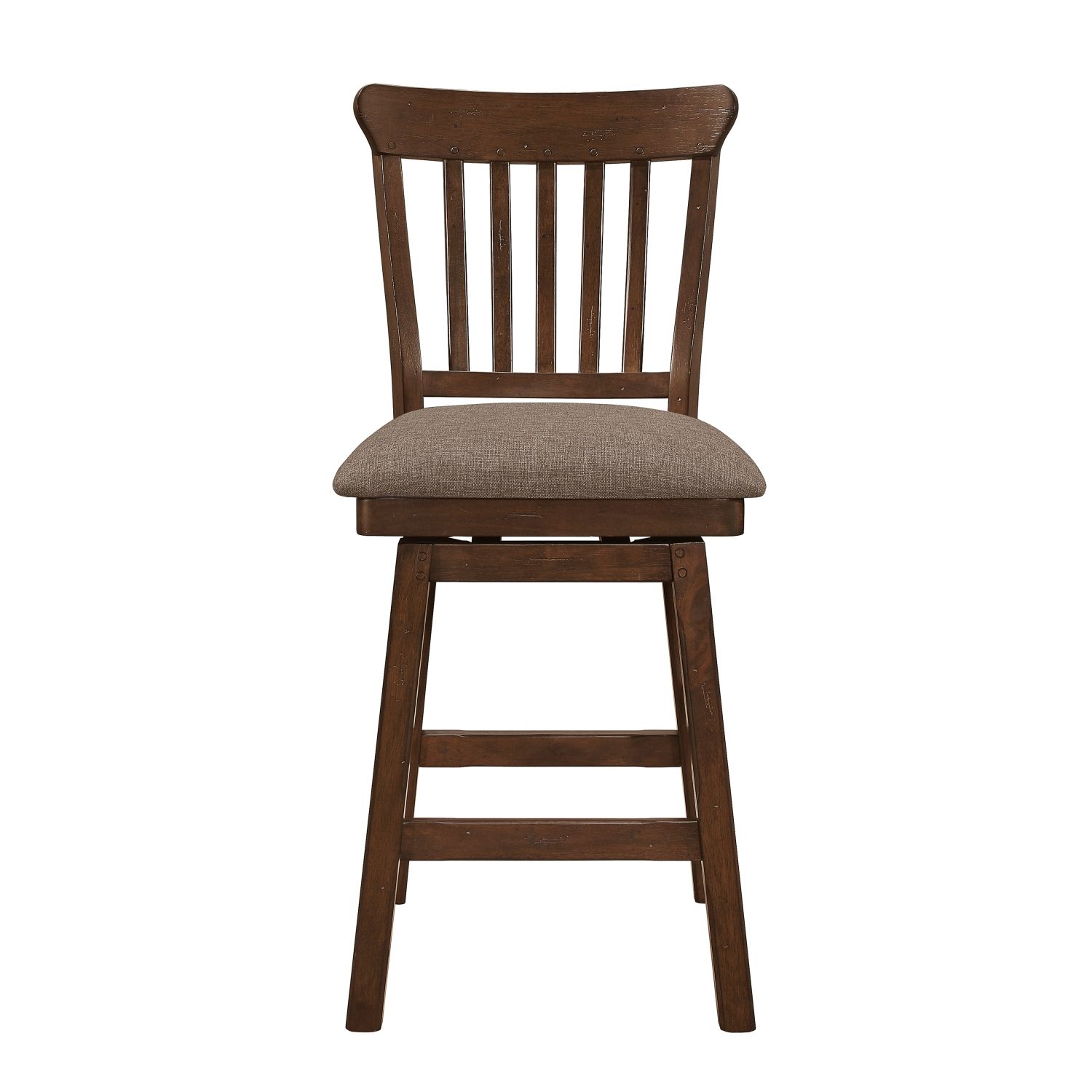 Transitionally styled with a burnished brown finish, the Schleiger Collection features bold accenting and functional storage options. The swivel chairs allows for versatile seating options for this industrial influenced look.PRODUCT DIMENSIONS: Overall Dimension: 20.5" x 21" x 42"HSeat Width: 19"Seat Depth: 17.5"Seat Height: 26"Listing Includes: Set of 2 Counter Height Chairs Only.Table & Bench: Not included.Simple Assembly Require.