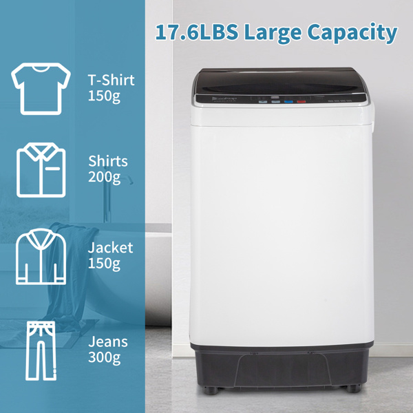 4.Easy to Operate & Time/Water Control, With a multifunctional control panel and LED display, easy to operate with one button. Our small portable washing machine has 10 programs and 8 water level selections for you to choose, meet specific laundry wash load needs.With this multi-functional washing machine, you will get a tailor-made service for more convenience.